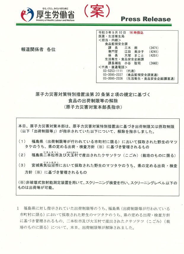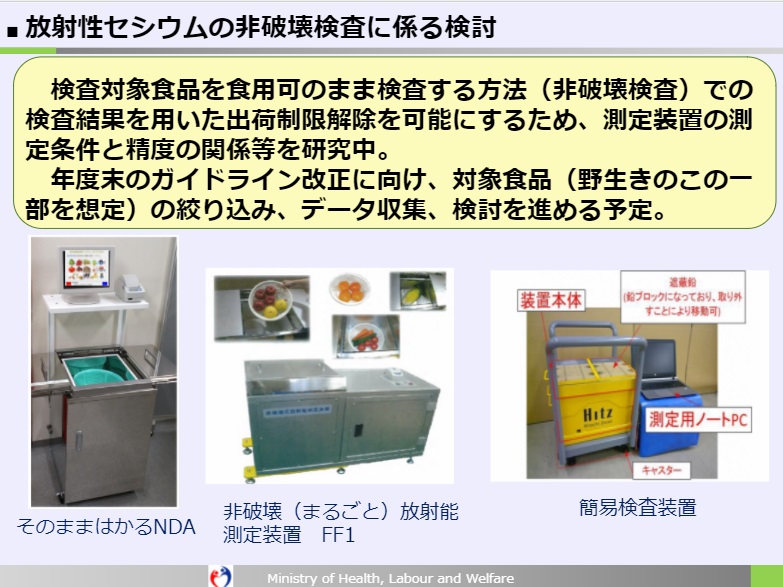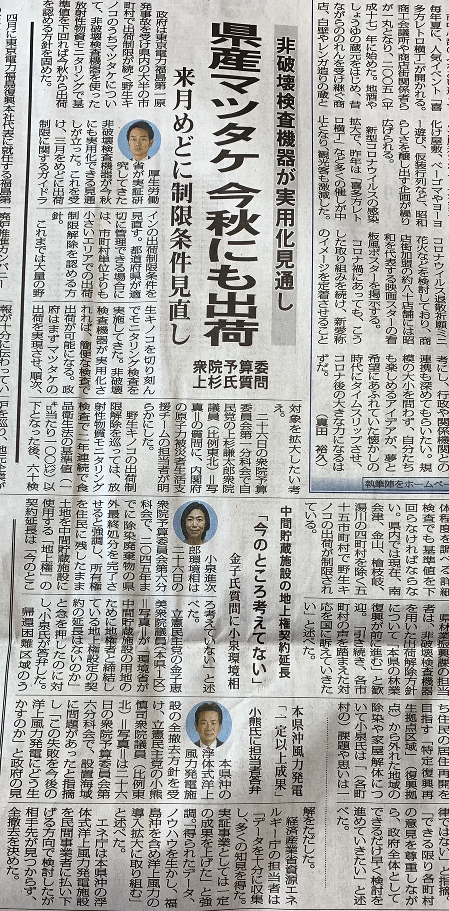 東京電力福島第一原発の事故により、県内で産出されてきた多くの天然ものの山菜・キノコ類は出荷停止の状態が続いています。従来の放射性物質の検査機では、産品を砕いて検査を行うため、検査をして安全性を証明した上で出荷ということができませんでした。これまで何度も委員会質問等で政府に新たな検査装置の開発を要望してきましたが、政府では厚生労働省をはじめ経済産業省、農林水産省などが連携して、産品を砕かずに検査できる非破壊検査装置が開発され、今年3月に食品出荷ガイドラインが改定されました。そしてついに今年9月、県産のマツタケの出荷が解禁となりました。