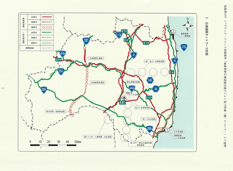 福島県では国道118号線の延伸拡幅等による郡山から水戸といった広域都市圏を結ぶ道路計画を進めています。国が整備などの方向性を定める新広域道路交通ビジョンにも示されているものです。高規格道路として整備されることで、高速化、大量輸送の実現が図られ、地域の発展に大きく寄与することが期待されています。