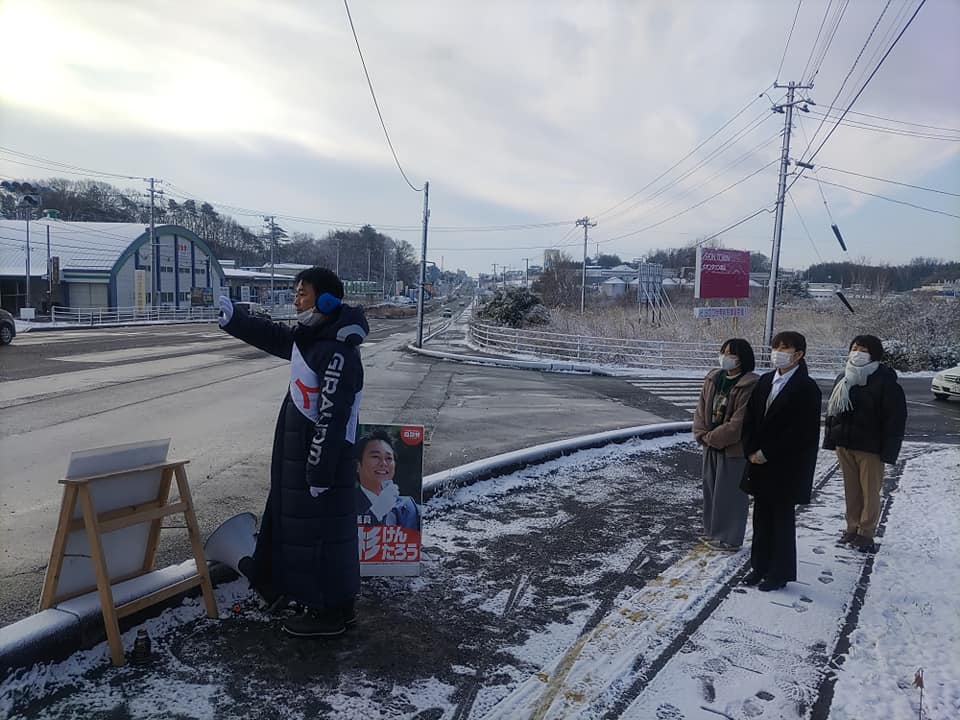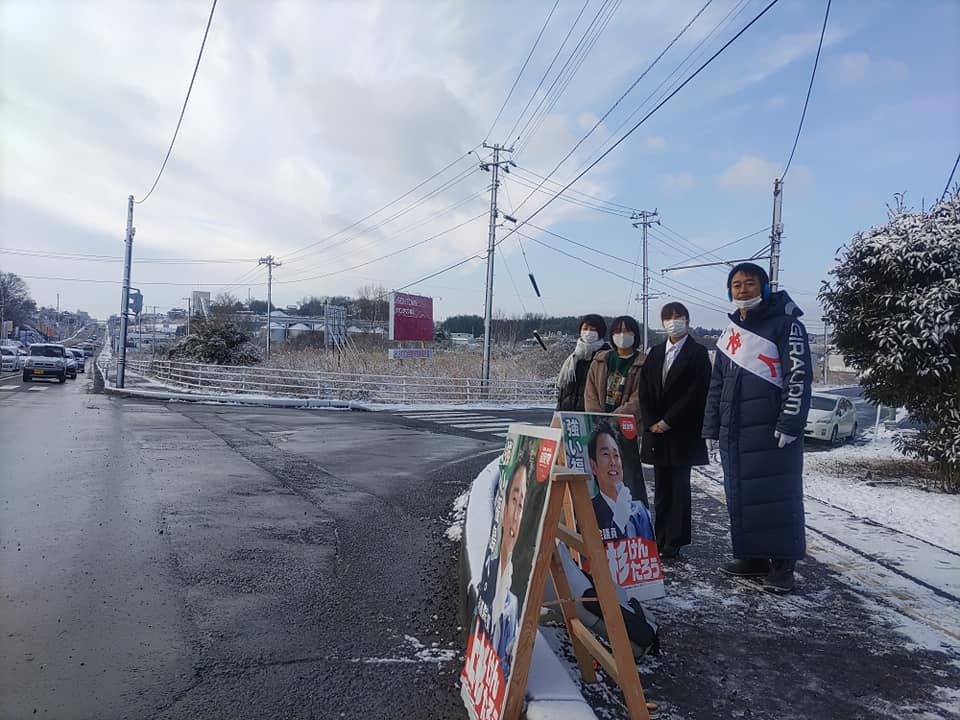 今朝は須賀川市滑川、ひばり温泉様前交差点で辻立ちです。